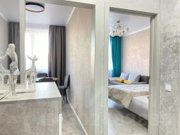 Одна изолированная спальня и современная кухня с новой техникой. Также есть вся необходимая посуда, электрический чайник, микроволновая печь.