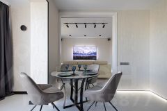 Парящие стены с подсветкой в зале и кухне. Во всей квартире красивый одноуровневый керамогранит с подогревом.