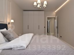 в первой спальной зоне большая современная кровать, телевизор, просторный гарнитур;