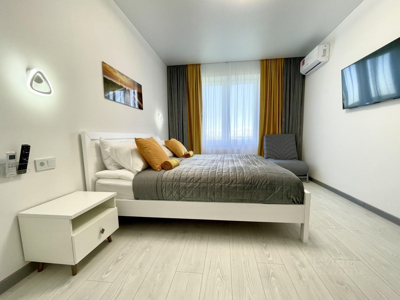 во второй спальной зоне большая современная кровать для родителей (180*200) с раздвижным креслом, телевизором, гарнитуром и отдельным кондиционером;