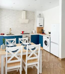 Насладитесь утренним кофе на уютной кухне-гостиной с балконом с панорамными окнами. Есть также все необходимое для приготовления еды для вашей компании.