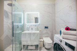 кондиционер , стирально-сушильная машина, индукционная варочная панель, микроволновая печь, холодильник. чайник, тостер, индивидуальная система отопления, теплый пол во всей квартире, телевизор 55, премиальное постельное белье, возможность бесконтактного заезда в любое время суток.