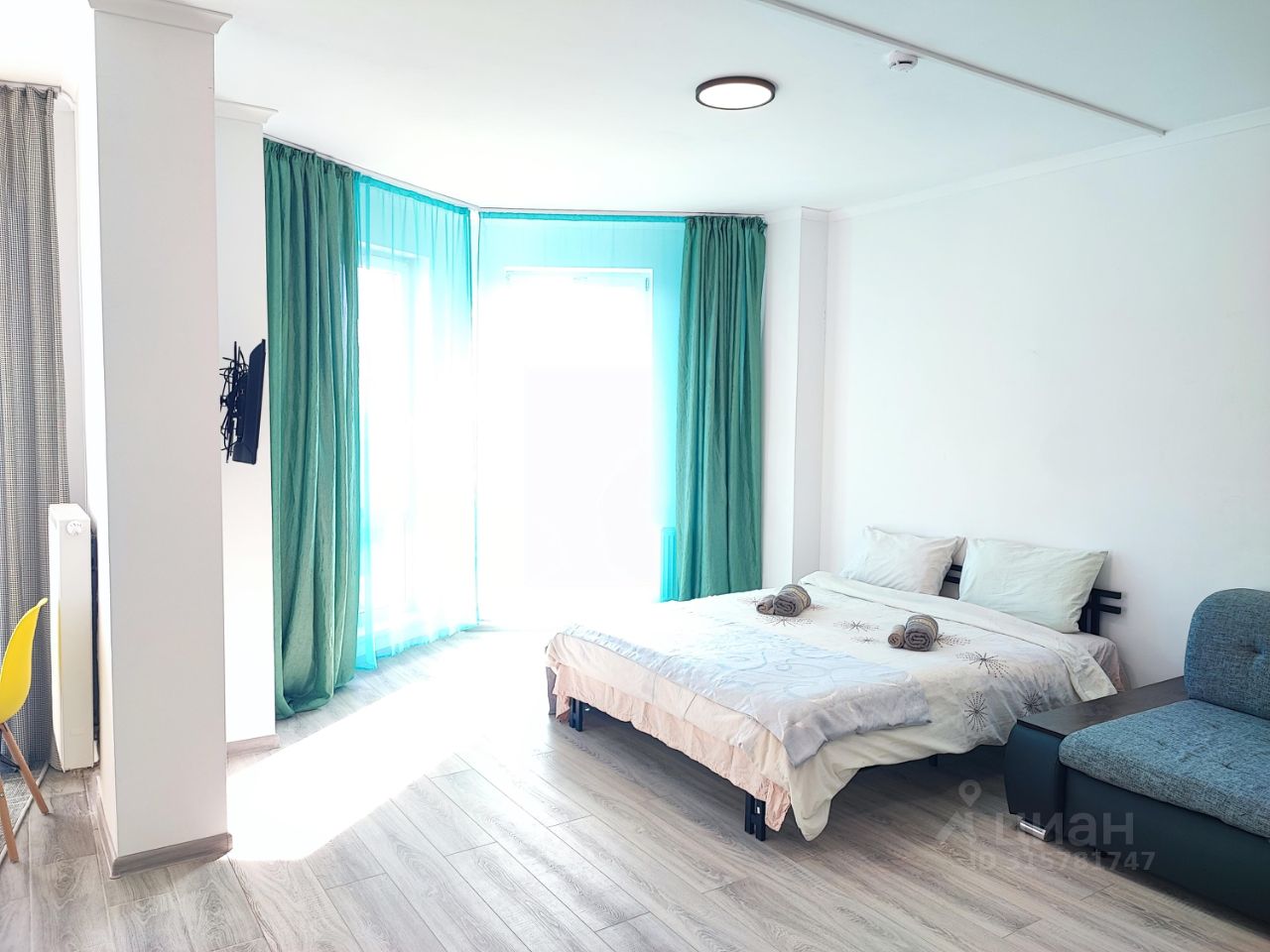 Спальных мест - 4(двуспальная кровать и угловой диван).