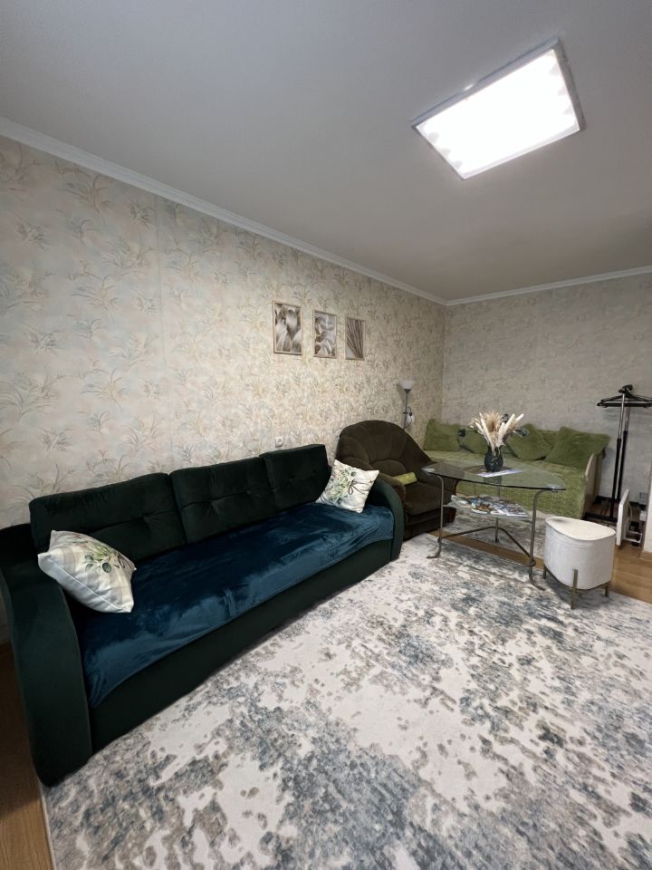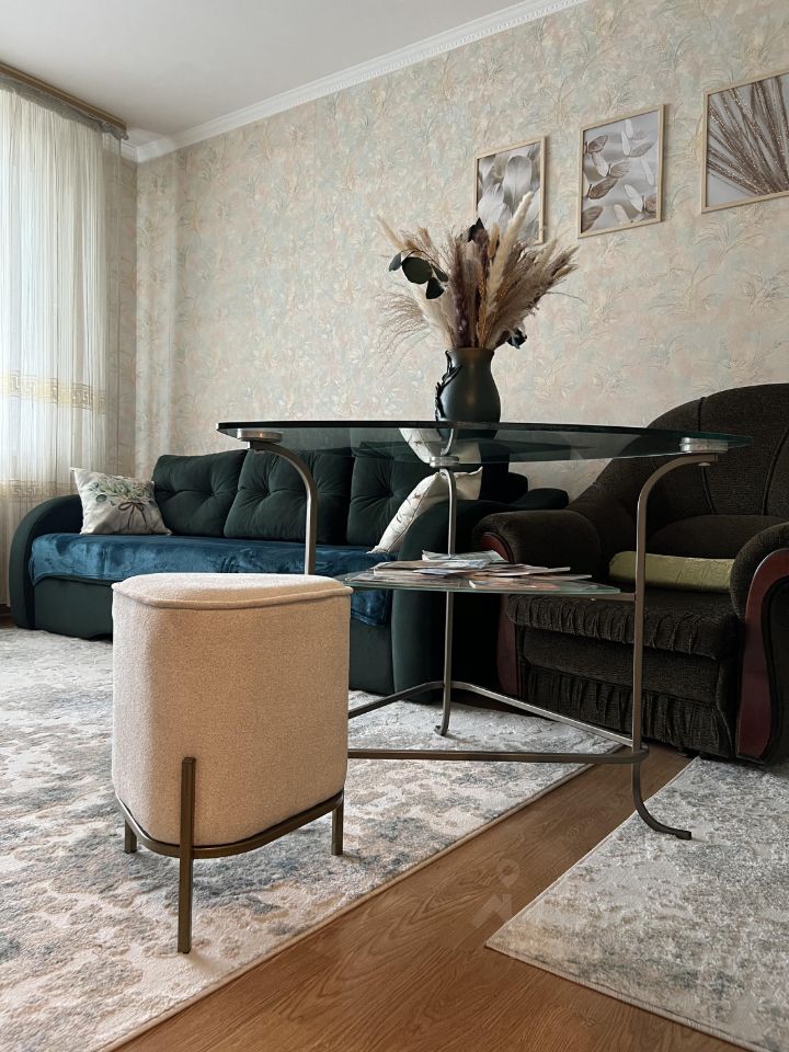В комнате установлены удобные диваны и кресло-кровать, а так же телевизор и столик, что позволяет комфортно проводить вечера с семьей или друзьями. Кухонная зона оборудована всеми необходимыми бытовыми приборами: варочной панелью, холодильником и микроволновой печью.