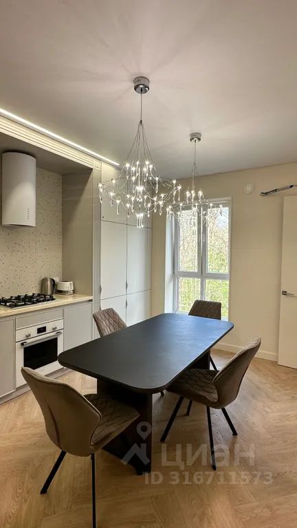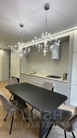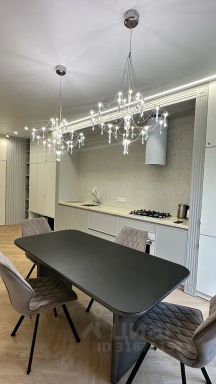 Встроенная кухня с каменной столешницей, шкафы, дизайнерский кухонный стол с комфортными стульями и креслами.