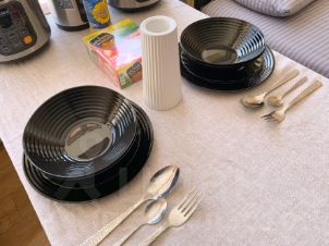 •Чай, кофе, сахар, соль, кастрюли и сковороды, кружки, тарелки, ложки, вилки.