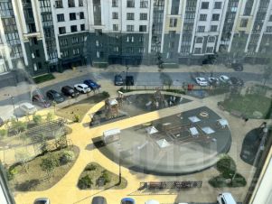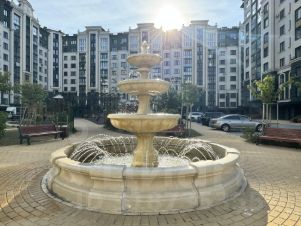 Вид во двор с фонтаном , и детской площадкой.