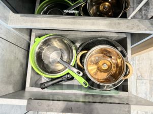 На кухне чайник, плита , микроволновая печь, большой холодильник, вся необходимая утварь и посуда.