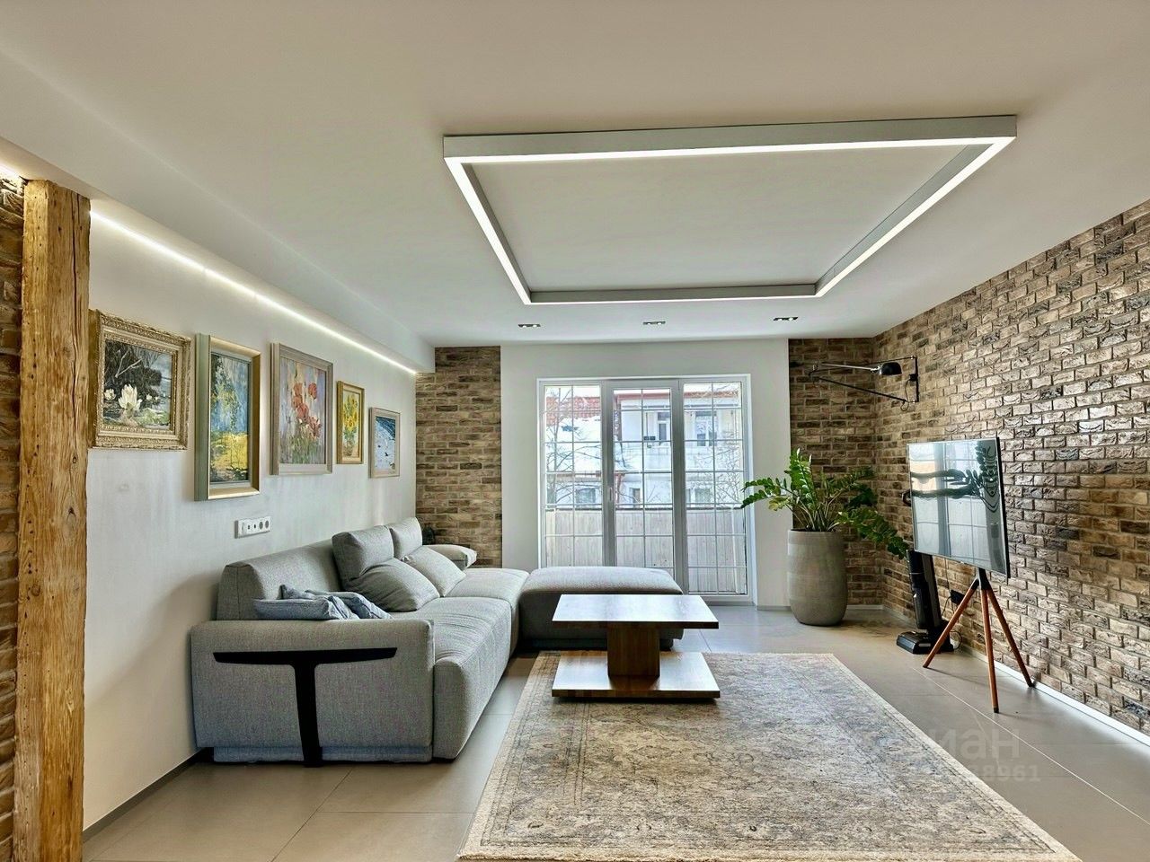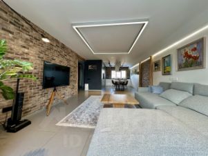 Гостиная зона - огромный диван, телевизор, журнальный столик, современные световые решения;