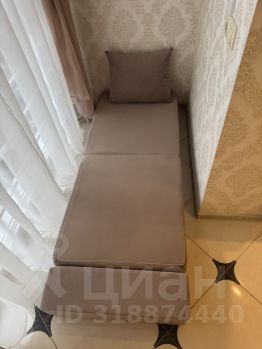 Зал- студия с кухней в которой находятся широкий, раскладывающийся диван. На балконе раскладной пуф.