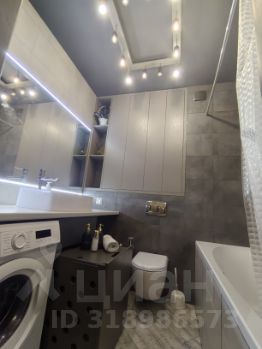 Ванная комната с большой ванной, шикарным понарамным зеркалом с подсветкой и подогревом, встроенным шкафом для хранения.Стиральная машина.