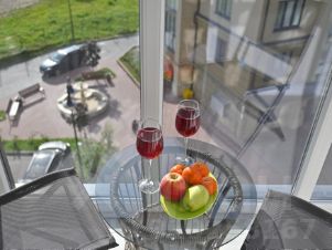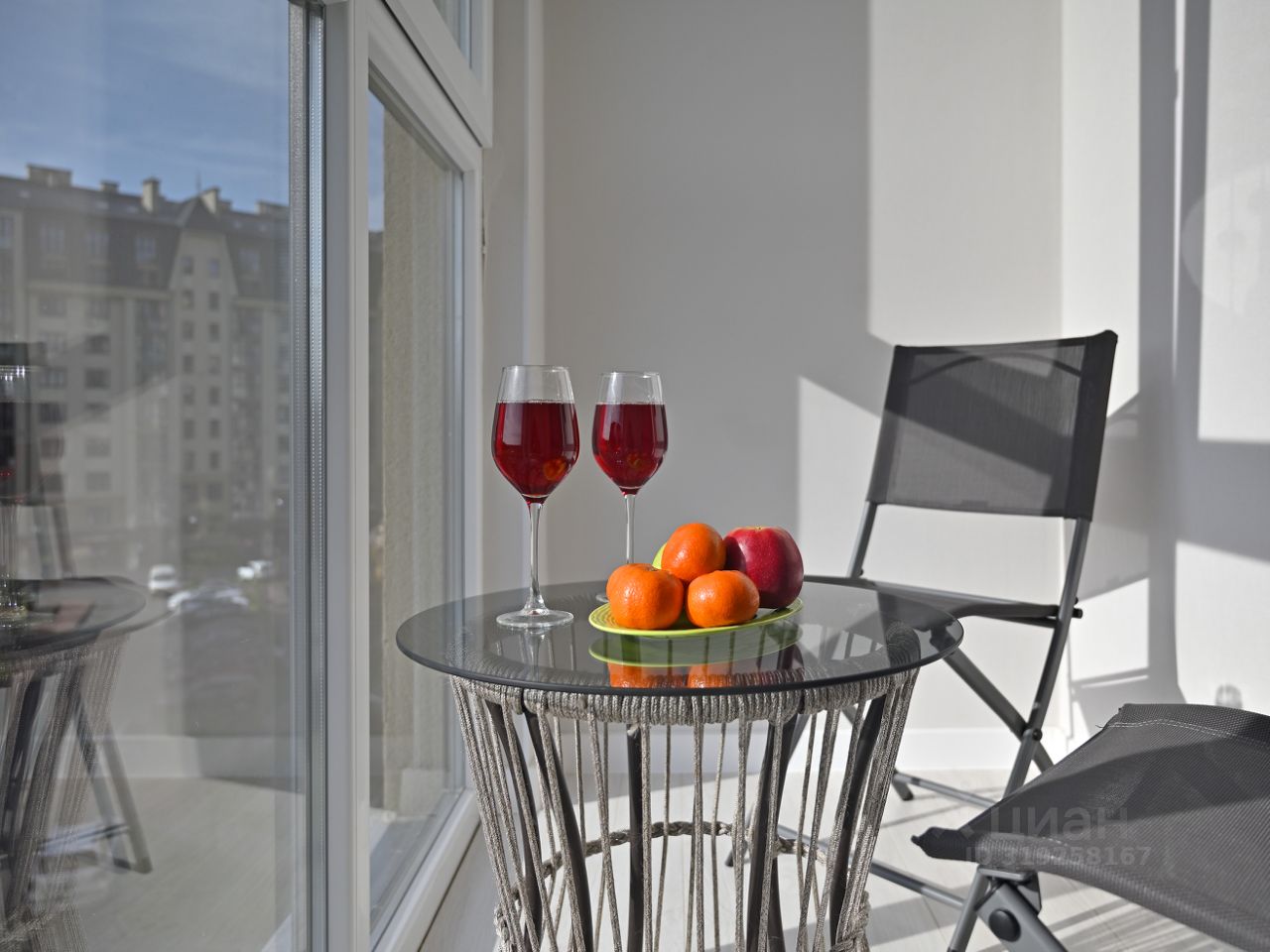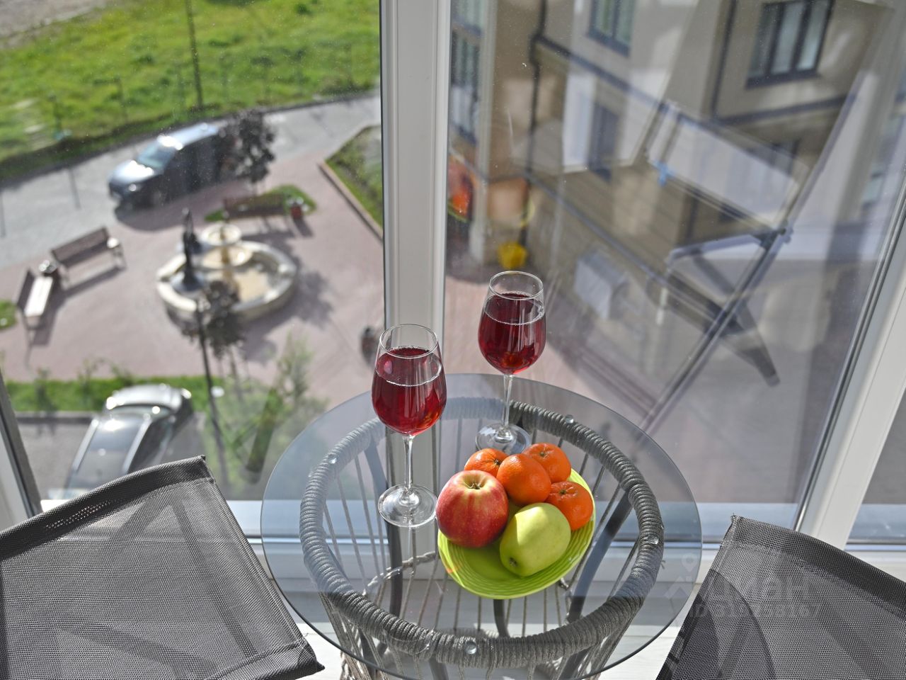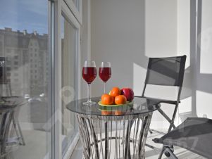 Лоджия с панорамным остеклением и открытый балкон с видом на фонтан.