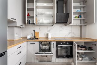 Варочной панелью, СВЧ-печью, электрочайником, холодильником, посудомоечной машиной, фильтром для воды.