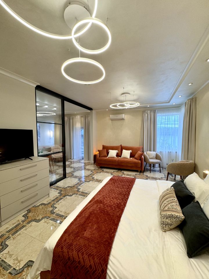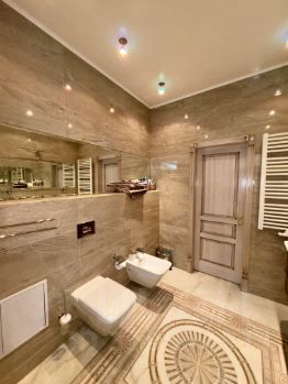 Так же, в апартаменты оснащены просторным санузлом с ванной, душевой кабиной, биде, гигиеническими принадлежностями.