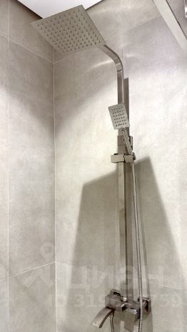 Ванная комната с душевой кабиной и средствами личной гигиены.
