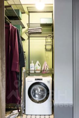 Уютная прихожая с встроенным гардеробом, стиральной машиной и утюгом.