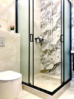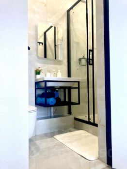 Особенностью этой квартиры является наличие двух просторных комнат, каждая из которых имеет собственную душевую кабину и туалет что придает приватность и уют.