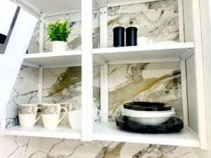 Кухня со всем необходимым (холодильник, плита, духовка, микроволновая печь, чайник, посудомойка, тостер, кофемашина, а так же посуда и приборы)