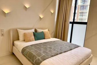 - Двуспальная кровать 160х200. Заправлена белоснежным постельным бельем.
