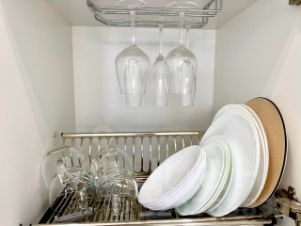 На кухне Вы найдете все необходимое для приготовления еды: посуда, столовые приборы, кастрюли и сковородки, микроволновка, холодильник, чайник, индукционная плита.