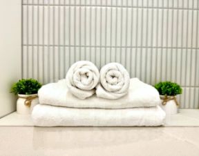 - Для каждого гостя подготовлено по 2 полотенца (для душа и рук) + 1 полотенце для ног.