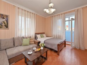 Спальные места: удобная кровать шириной 140 см для двоих и раскладной диван шириной 180 см, где с комфортом разместятся еще два человека.