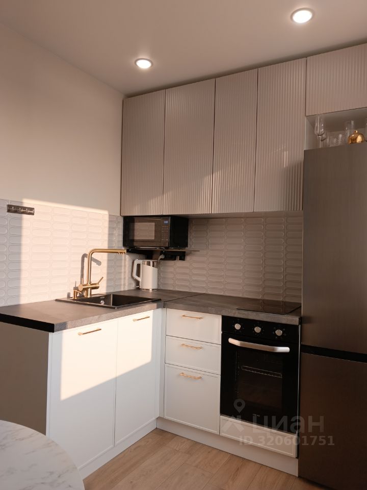 Кухня: холодильник, плита, духовка, микроволновка, чайник, набор посуды и приборов.