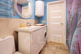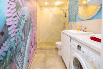 Ванная комната с ярким и необычным дизайном: с душевой кабиной, сан. узлом, большим зеркалом, с полотенцами и средствами гигиены. В ванной комнате также располагается стиральная машина и водонагреватель.