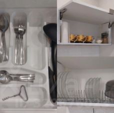Комплект посуды, газовая плита, микроволновая печь, холодильник, чайник, посудомоечная машина