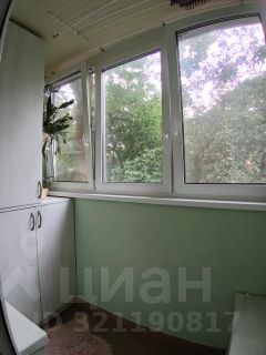 Застекленная лоджия, окна во двор, перед окнами зелёный сад.