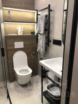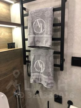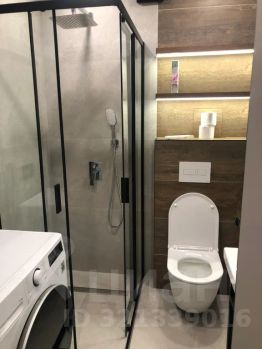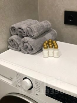 Современная ванная комната: стиральная машина, утюг, фен, полотенца, гигиенический набор, тапочки.