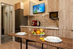 В квартире есть: фен, телевизор с кабельными каналами. Кухня оснащена: холодильником, плитой, электрическим чайником, микроволновой печью, кофемашиной, чай, кофе, сахар, соль, перец, подсолнечное масло всегда в наличии. Бесплатный Wi-Fi.