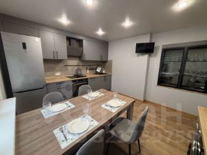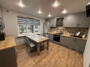 Большая комфортная кухня с обеденной зоной со всей необходимой мебелью, техникой и посудой.