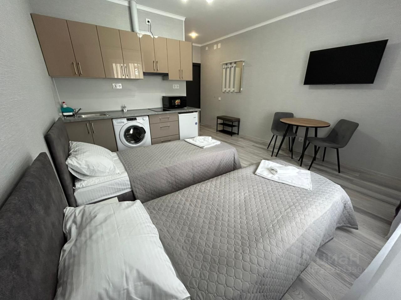 Апартаменты 6 однокомнатные, рассчитаны на двух гостей. В номере две раздельные односпальные кровати. По желанию гостя кровати можно соединить, сверху укладываем топпер и превращается в полноценную двухспальную кровать.