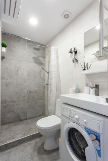 - Современная бытовая техника: СВЧ-печь, мини-холодильник, электрочайник, электр.варочная панель 2 комфорки, утюг, гладильная доска и сушилка, стиральная машина, фен