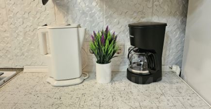 - современная бытовая техника: СВЧ-печь, холодильник, электрочайник, кофеварка, утюг, стиральная машина, фен
