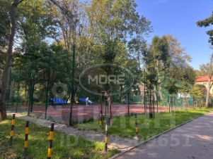Огороженная современная спортивная площадка для взрослых и детская площадка с прорезиненным покрытием.