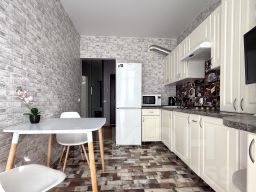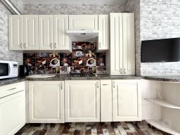 Кухня оборудована всей необходимой техникой, посудой и прочей утварью. Варочная газовая поверхность, , холодильник, микроволновая печь, чайник, кофеварка, телевизор