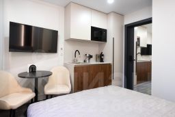 В студии предусмотрено всё для комфортного проживания. Уютная двуспальная кровать (140x200) обеспечит спокойный сон после активного дня. Кухонная зона оснащена плитой, микроволновой печью, холодильником, кофемашиной и фильтром для воды, что делает приготовление пищи максимально удобным. Для отдыха гостей предусмотрен телевизор, а ванная комната с душем и туалетом обеспечивает дополнительные удобства.