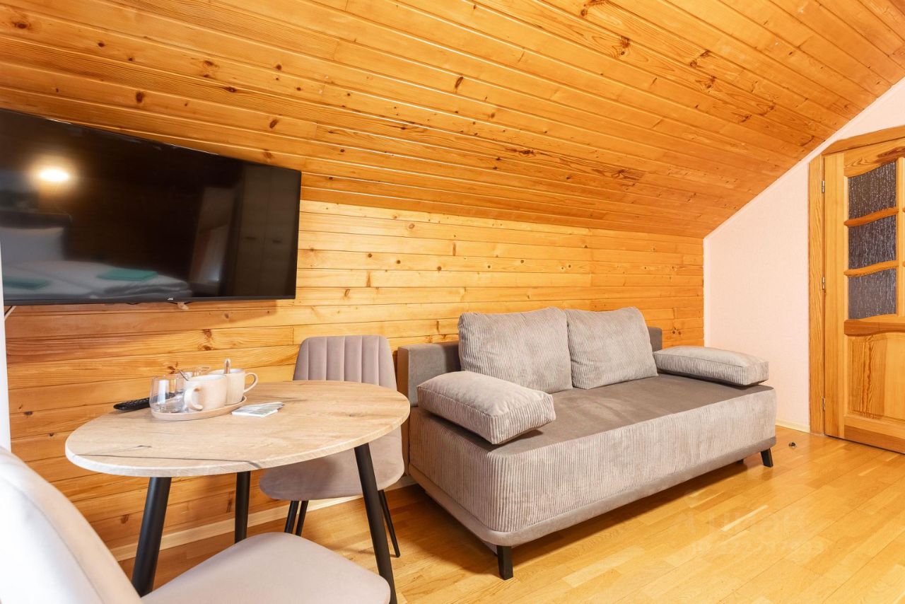Мансарда оснащена двуспальной кроватью 200*160 с ортопедическим матрасом, раскладным диваном и предназначены для размещения 4-х гостей с возможностью дополнительного предоставления комфортной раскладной кровати в количестве 1 шт. за доп. плату. В номере также предусмотрена ванная комната с душевой кабиной, феном и набором туалетных принадлежностей. Гости могут воспользоваться бесплатным Wi-Fi, телевизором. Для удобства имеется мини-холодильник и электрический чайник с набором для приготовления чая и кофе.