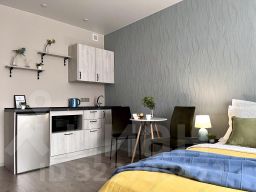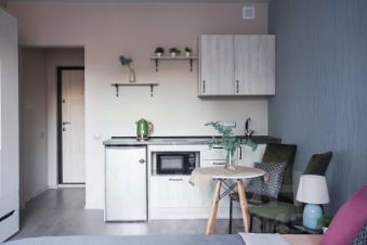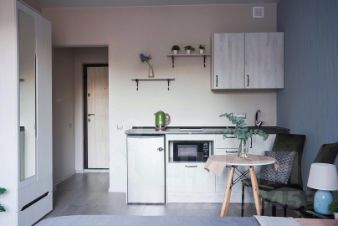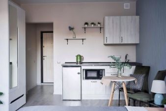 В студии полностью оборудованная мини-кухня с микроволновой печью, гостиный уголок, телевизор с плоским экраном, стиральная машина и собственная ванная комната с душем и тапочками. Также имеются холодильник, плита, чайник.