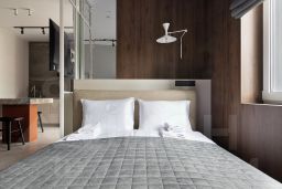 В апартаментах: двуспальные кровати 160200, диван-кровать или односпальный диван; кухня с плитой, микроволновкой, холодильником, посудомоечной машиной, кофемашиной и фильтром для воды; застеклённые лоджии; ванные комнаты с душевыми кабинами, гигиеническим душем; стиральная и сушильная машины; телевизор, Wi-Fi, кондиционер (в "Малевиче"). Интерьеры: "Централ Парк" — современное и уютное пространство; "Малевич" — яркая евродвушка в стиле русского авангарда с нестандартными дизайнерскими акцентами.
