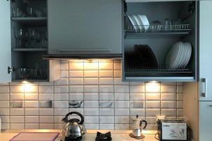 -Микроволновка, духовой шкаф, газовая плита, чайник, полный комплект посуды.-