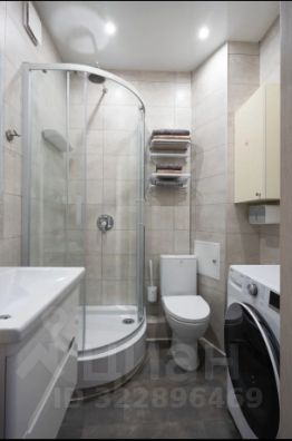 - Ванная комната оснащена душевой кабиной, умывальником, унитазом, стир. машина 2в1 (с функцией сушильной машины), полотенцесушителем и феном.