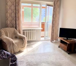 Внутри квартиры есть всё необходимое для комфортного проживания. На кухне и в комнате установлена мебель. К вашим услугам холодильник, телевизор и стиральная машина. Санузел совмещённый, в ванной комнате установлена ванна. Также имеется балкон, где можно устроить небольшую зону отдыха.