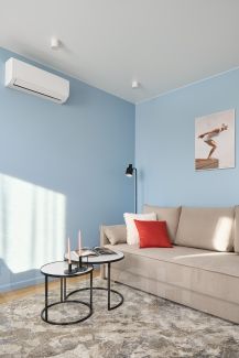 Комната поделена на зона отдыха и сна. Двуспальная кровать 160/200, с удобным матрасом. Телевизор диагональ 54 дюймов. Двуспальный диван спальное место 150/195(2100/1100). Гардеробная. В комнате установлен кондиционер.