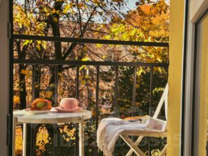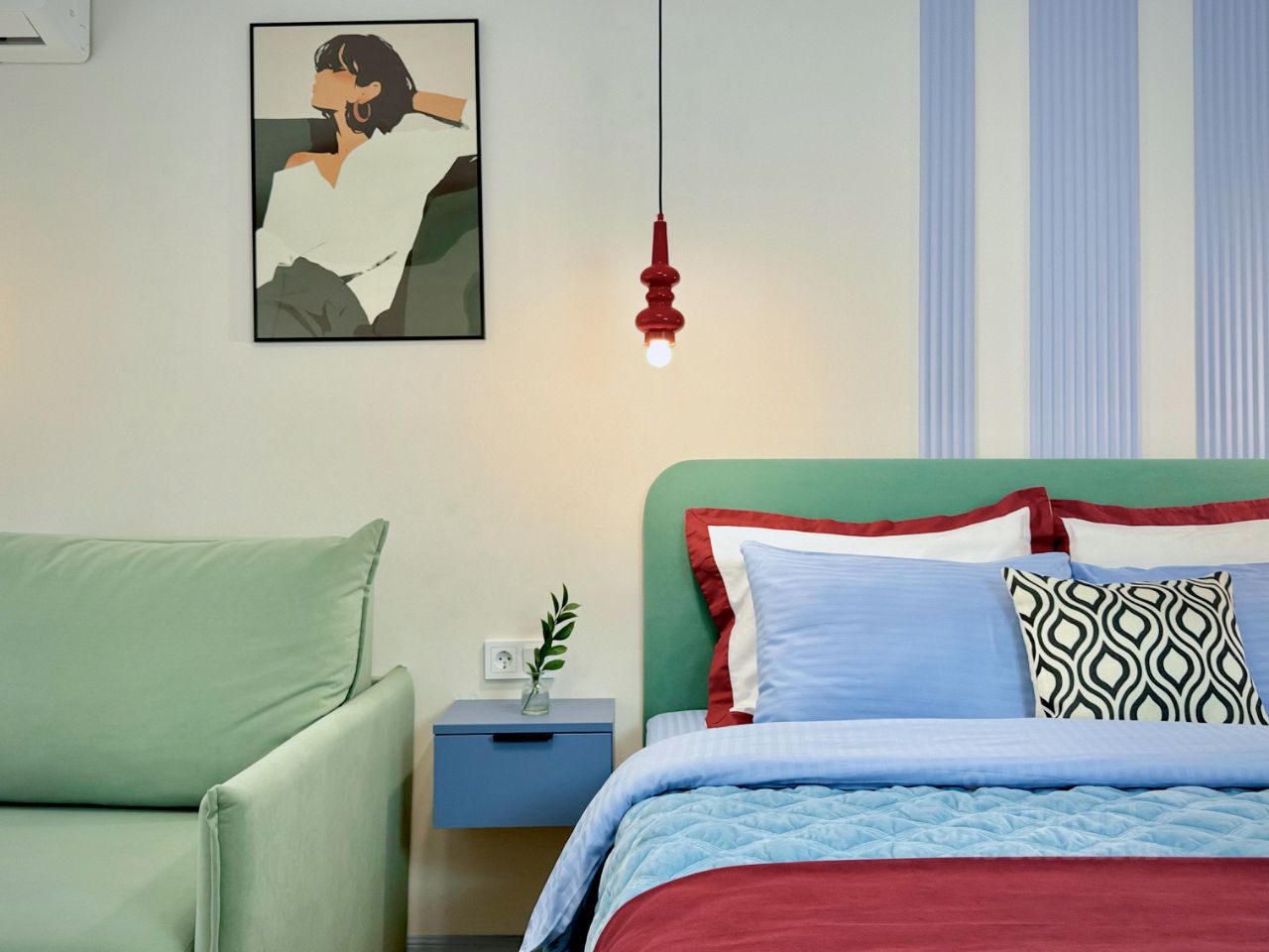 Для комфорта гостей постельное белье страйп-сатин, кондиционер, стиральная машинка, капсульная кофемашина, два смарт ТВ, рабочий стол, два шкафа и открытый балкон.