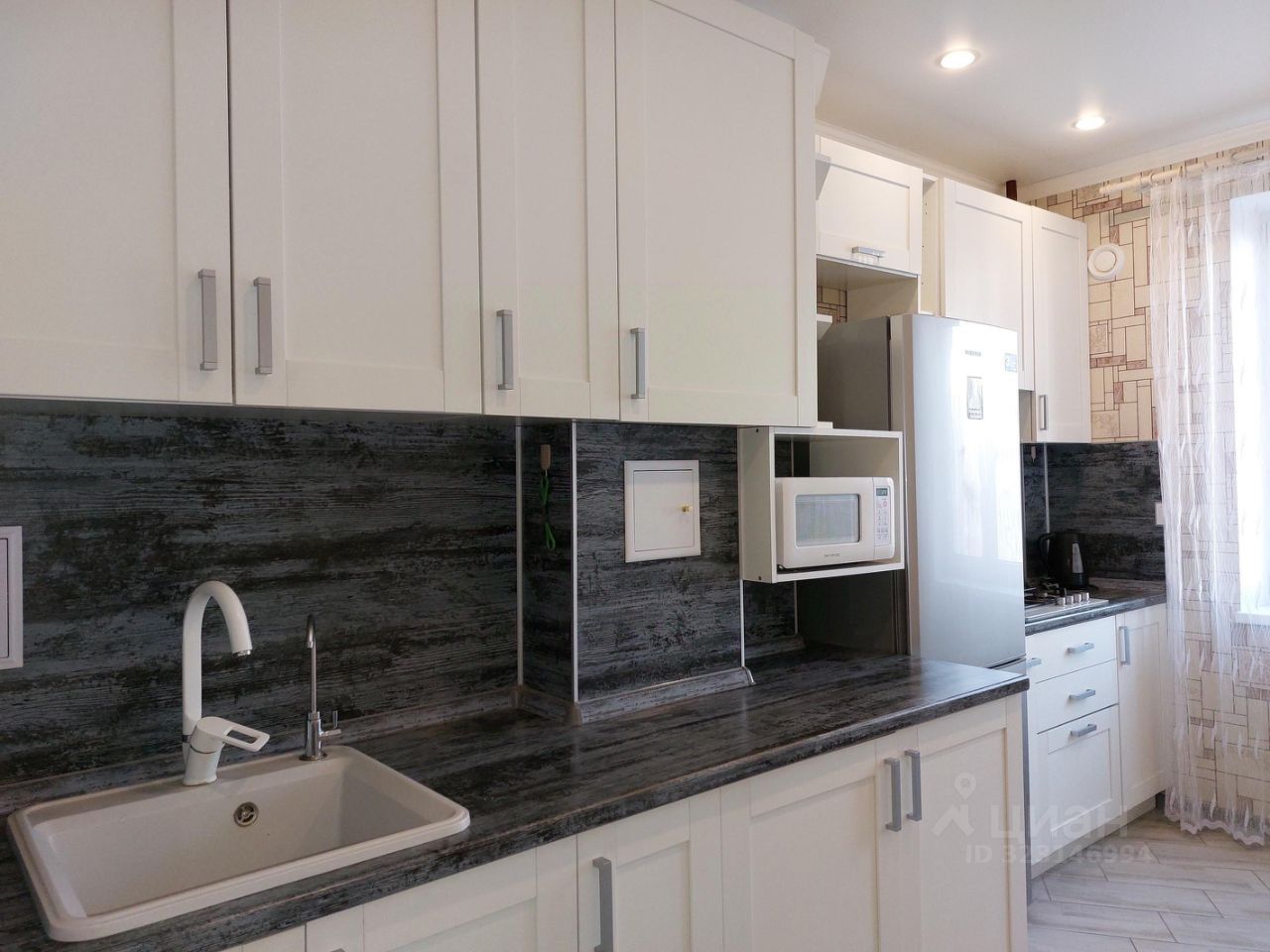 На кухне: встроенный кухонный гарнитур, раковина со смесителем, фильтр очистки воды, 4-х конфорочная газовая варочная поверхность, холодильник двухкамерный, стол, 4 табурета, гардина, штора-тюль, микроволновая печь, чайник электрический, вытяжка, посуда;