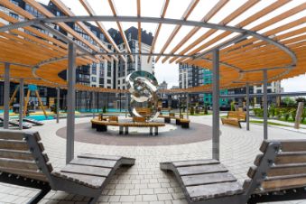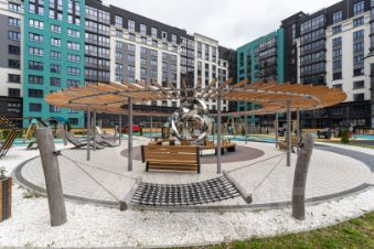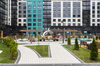 Территория дома огорожена и благоустроена: детские и спортивные площадки, зоны отдыха.