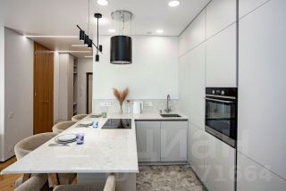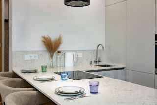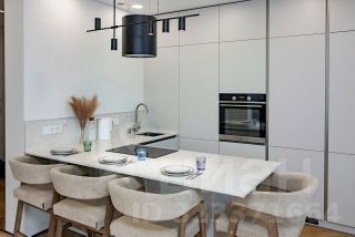 Полностью оборудованная кухня: индукционная плита, посудомоечная машина, духовой шкаф, холодильник, СВЧ-печь и вся необходимая посуда.